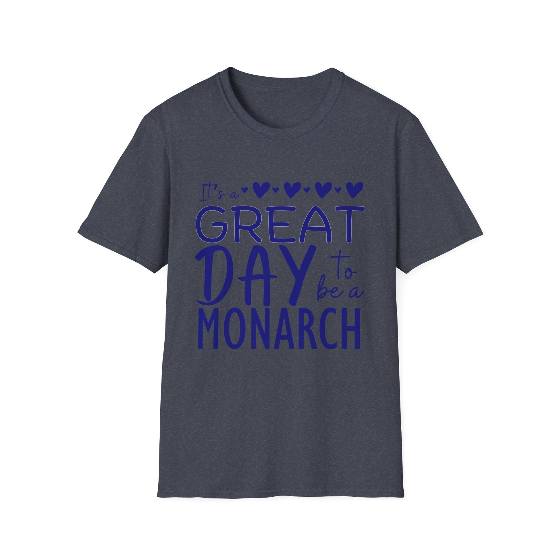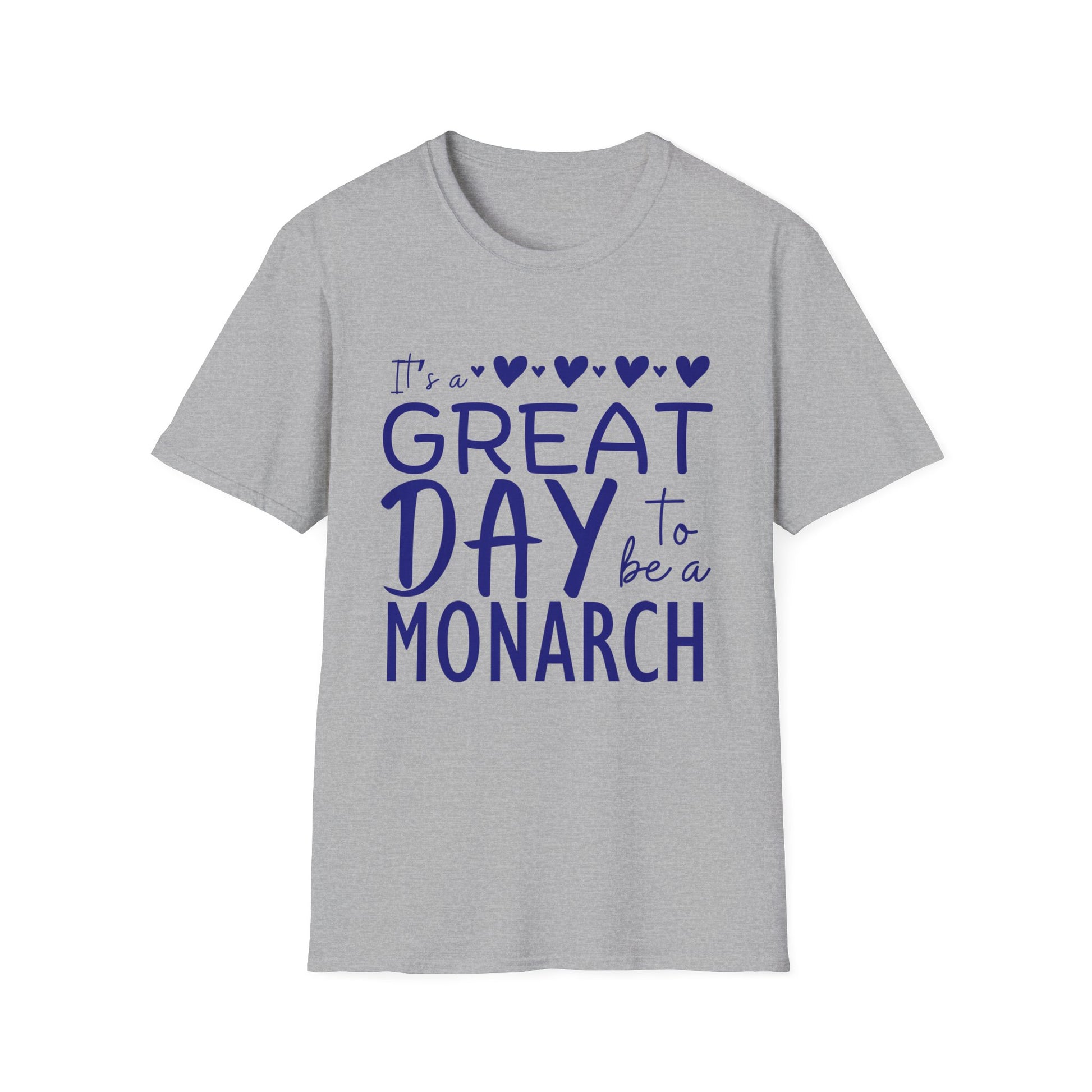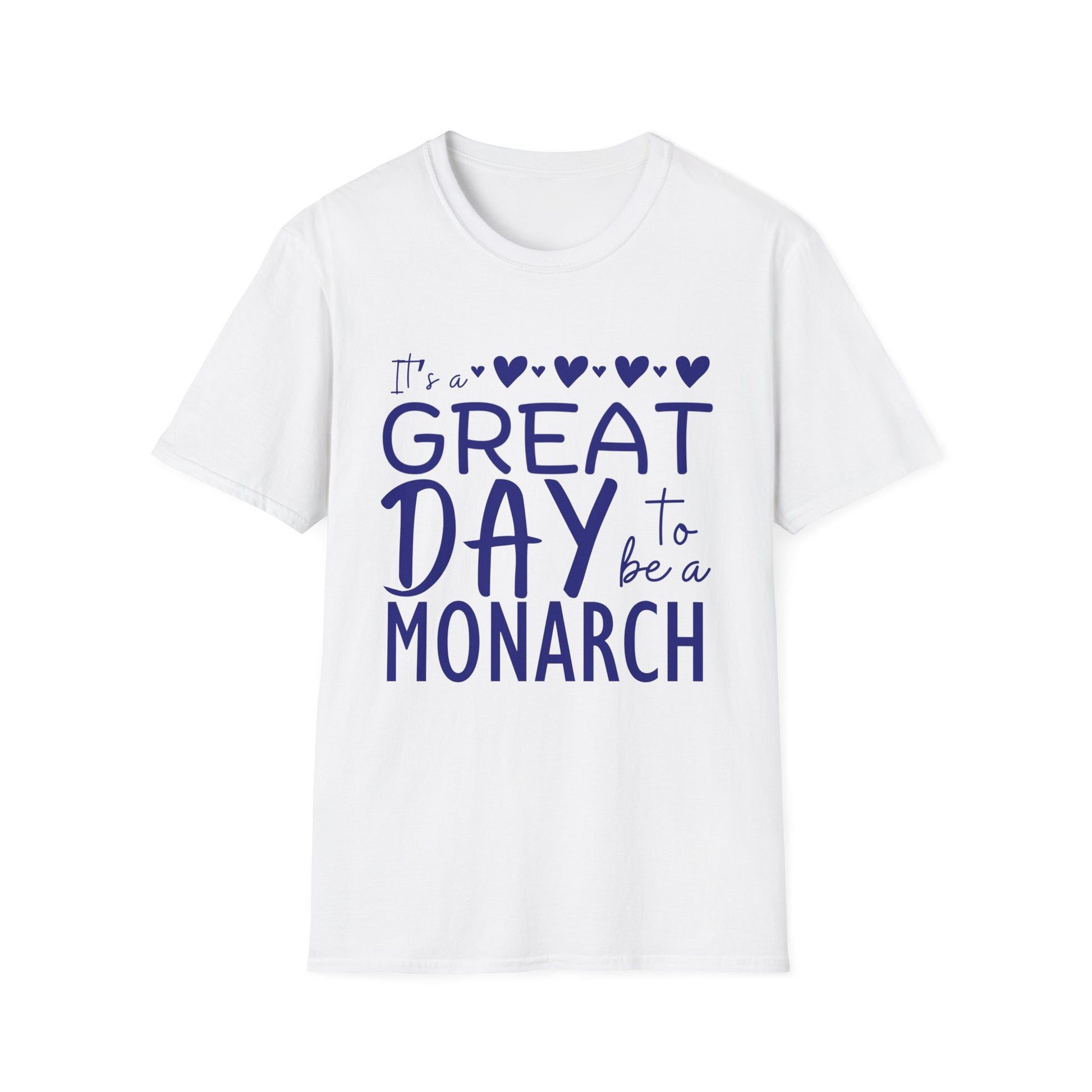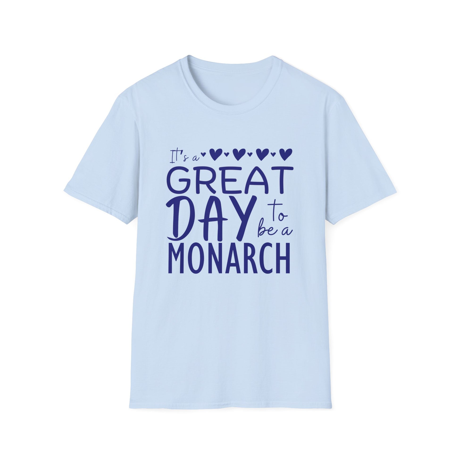 "It's a Great Day to Be a Monarch" Blue Lettering Unisex Softstyle T-Shirt - Fun & Cheerful Graphic Tee